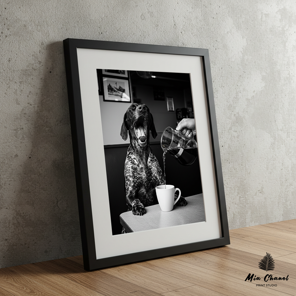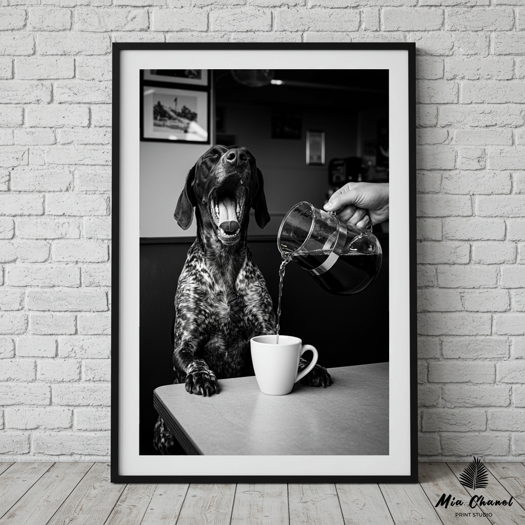 Bring a smile to your face every morning with this hilarious black and white digital art print. Capturing a wonderfully anthropomorphic moment, this photograph shows a very tired-looking dog, paws on the table, mid-yawn, as a hand pours coffee into a mug for him at a classic diner booth.
