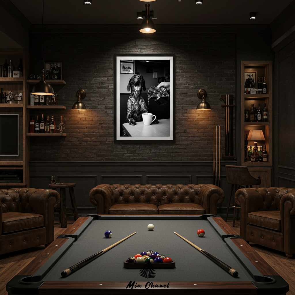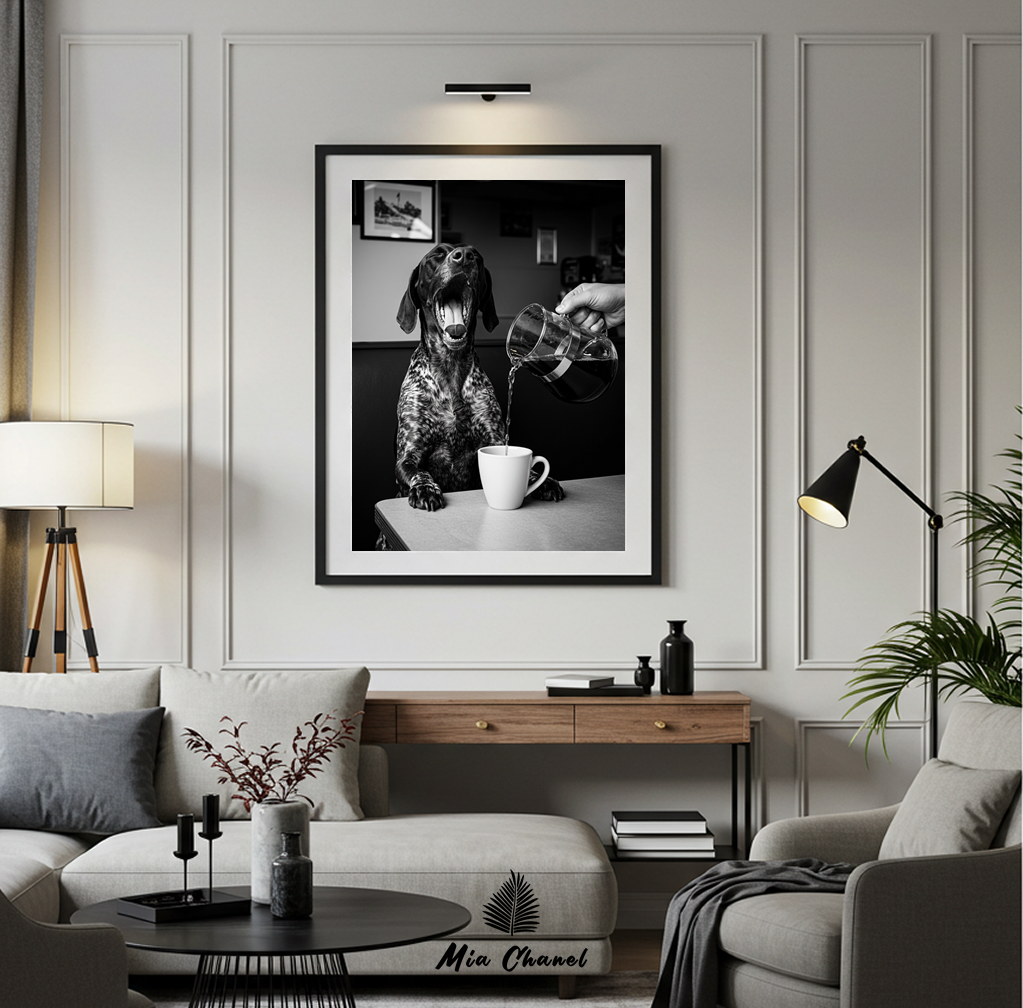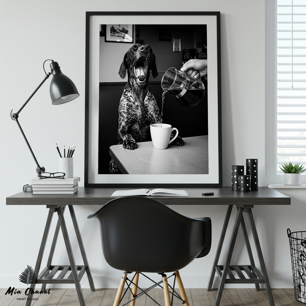 The vintage black and white aesthetic enhances the timeless humor and charm of the scene. This print is perfect for anyone who understands the need for that first cup of coffee (or just loves a good laugh!). It’s a unique piece that adds personality and warmth to any space, celebrating the relatable struggle of waking up in a whimsical way.