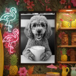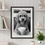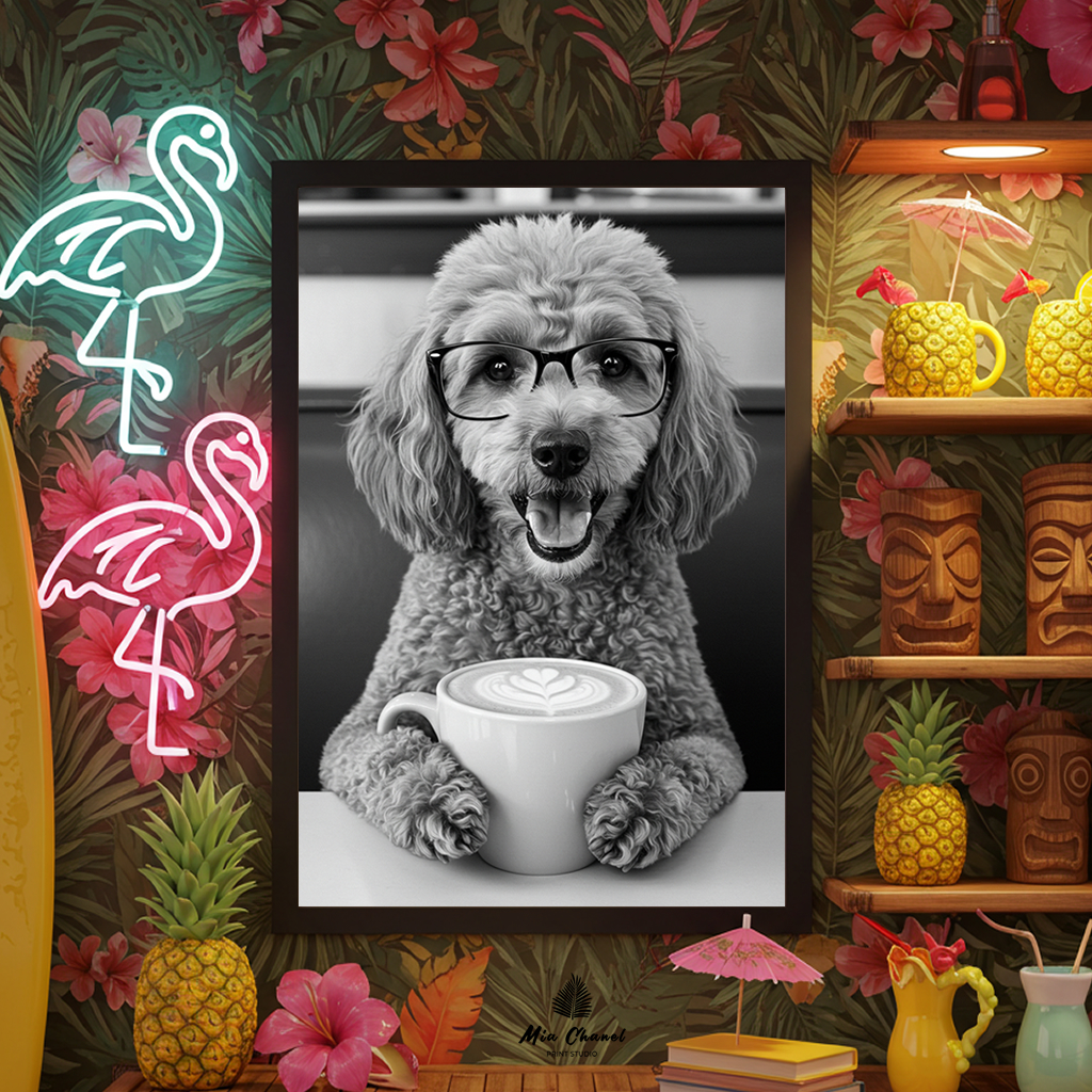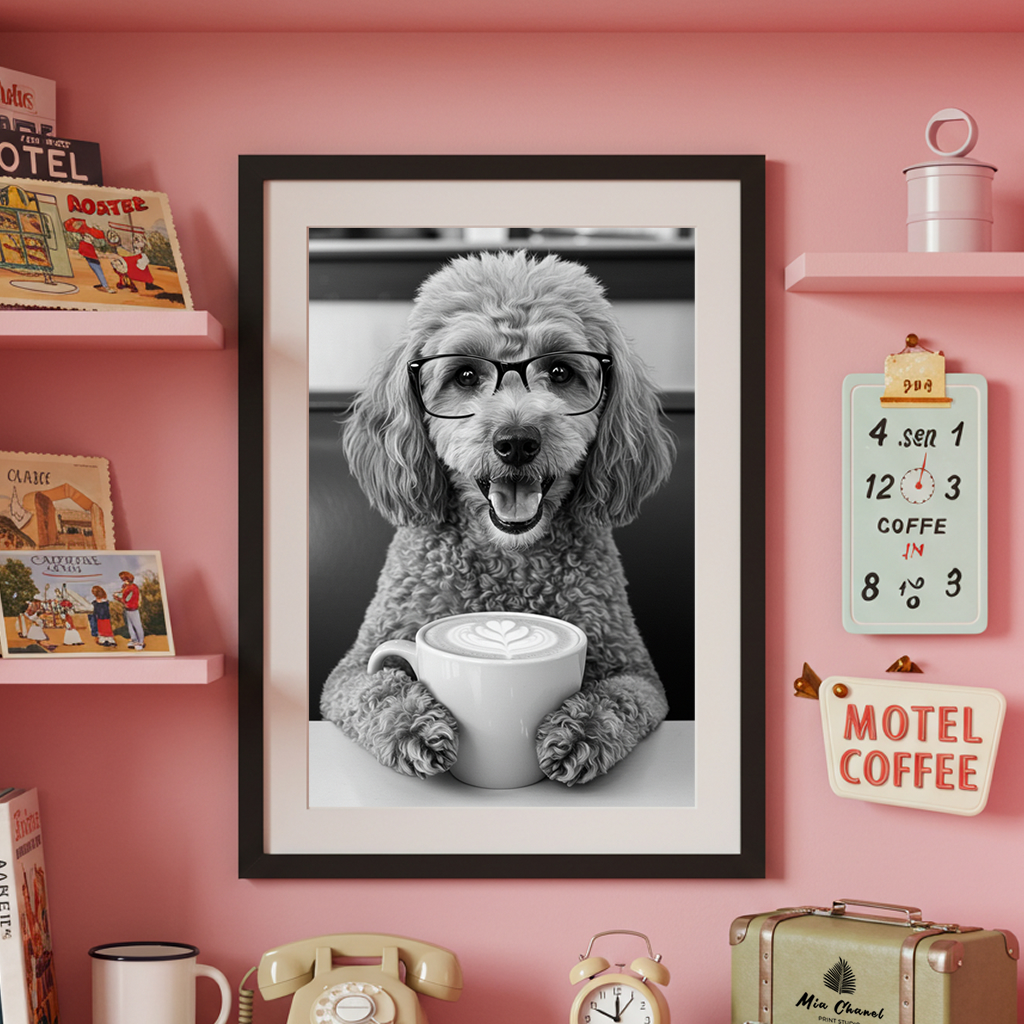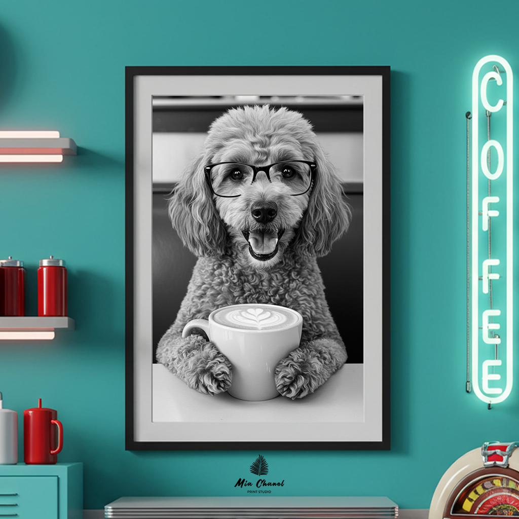 Add a touch of sophisticated whimsy to your space with this delightful black and white art print! This charming image features a happy Poodle sporting a pair of stylish glasses and contentedly holding a mug of coffee topped with beautiful latte art.