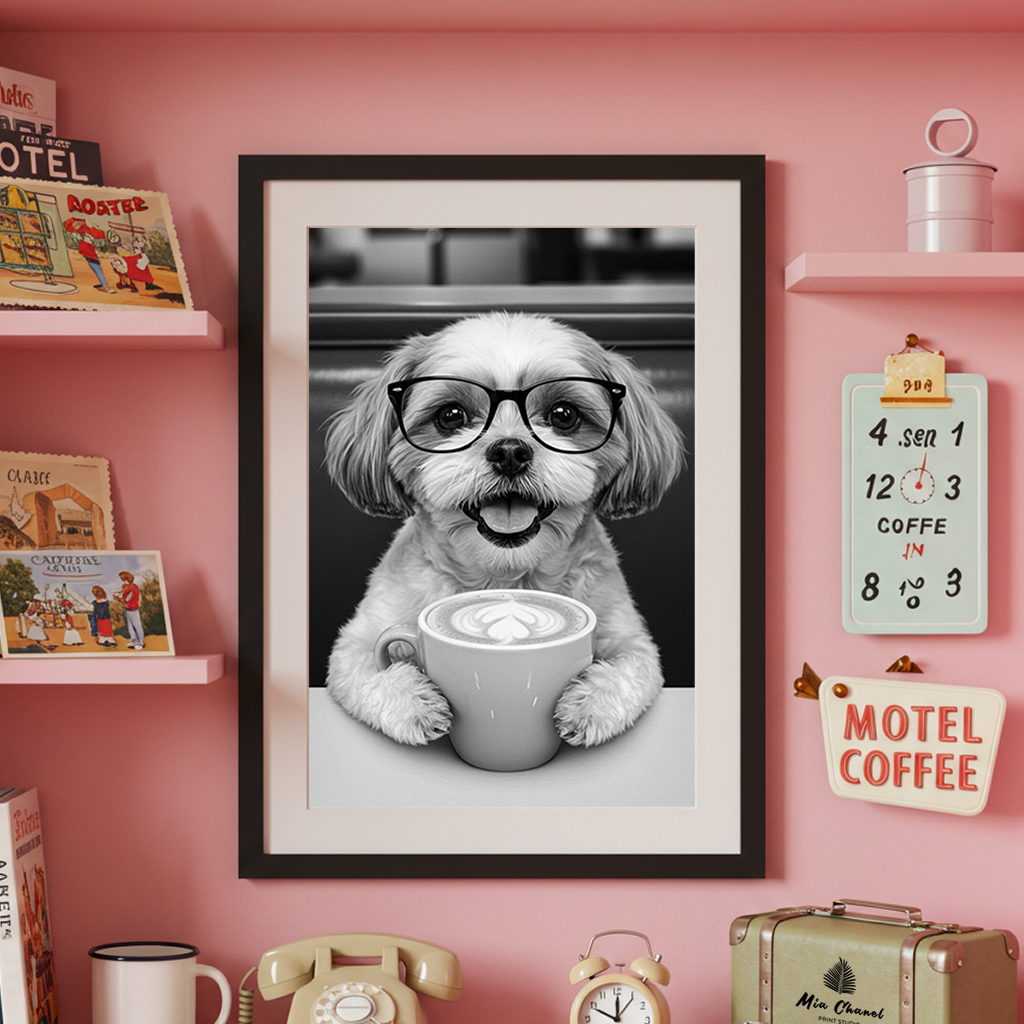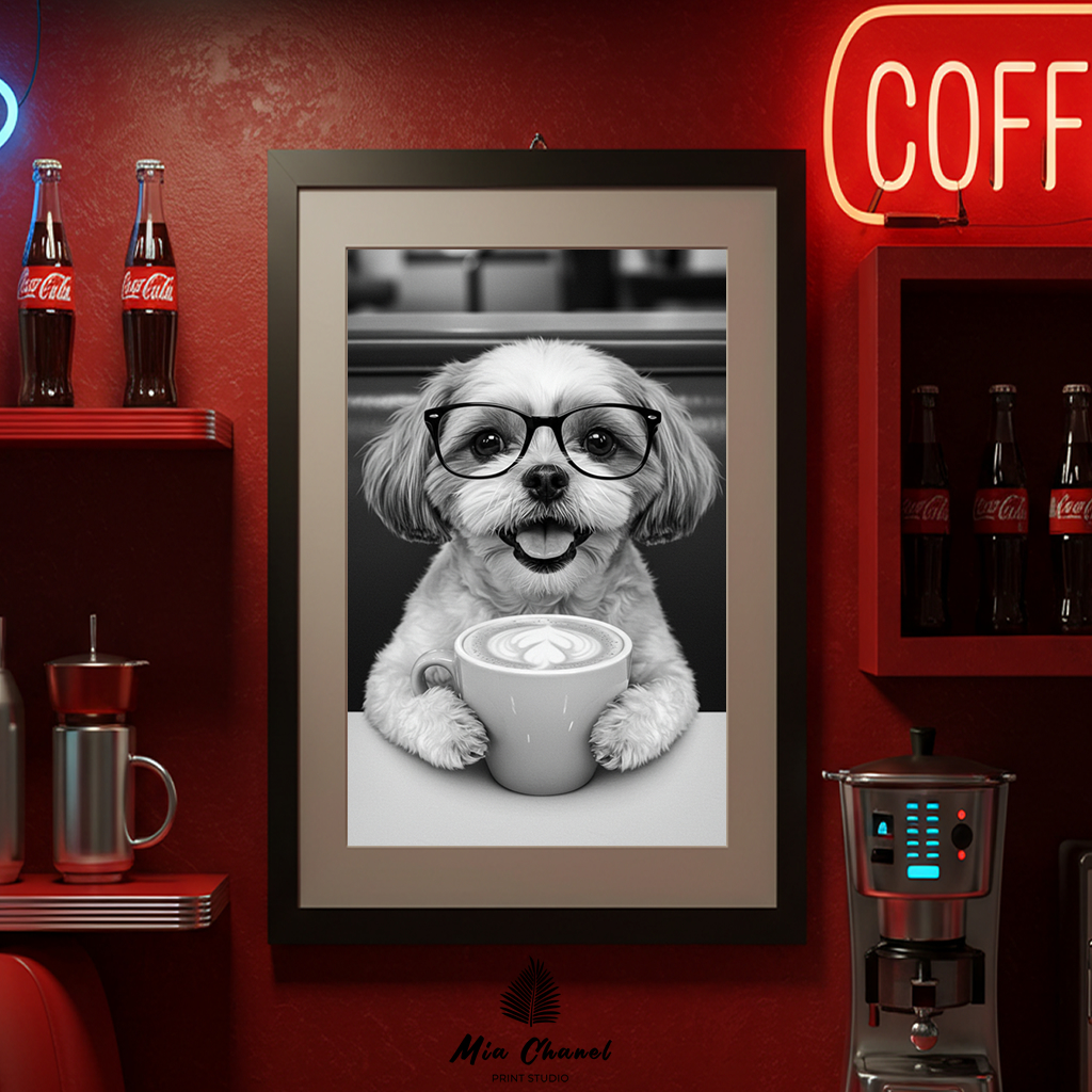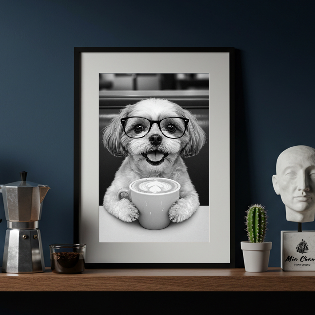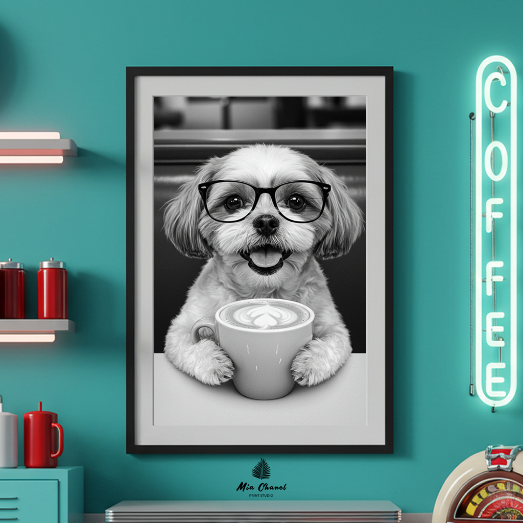Add a sprinkle of joy and humor to your space with this absolutely adorable black and white art print! This charming image features a happy Shih Tzu sporting a pair of trendy glasses and holding a warm mug of coffee topped with beautiful latte art.
