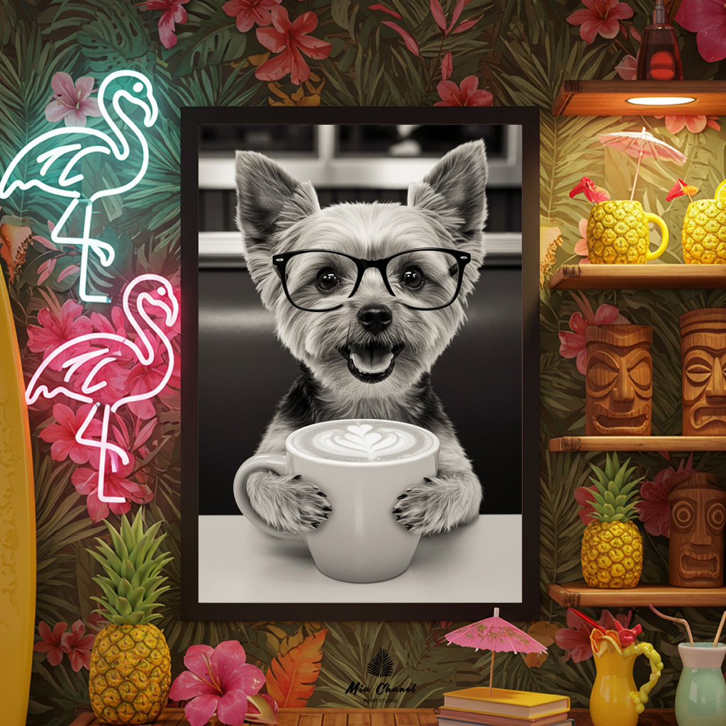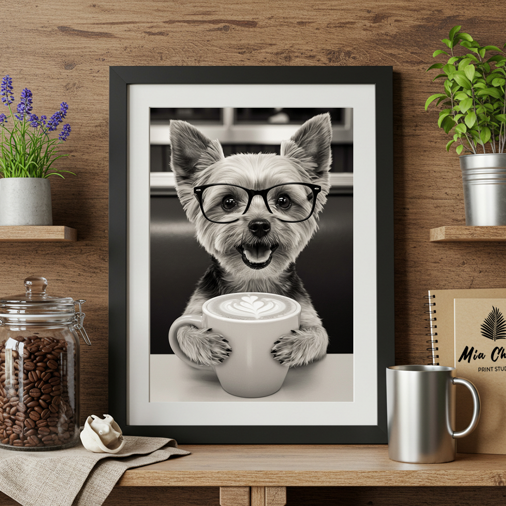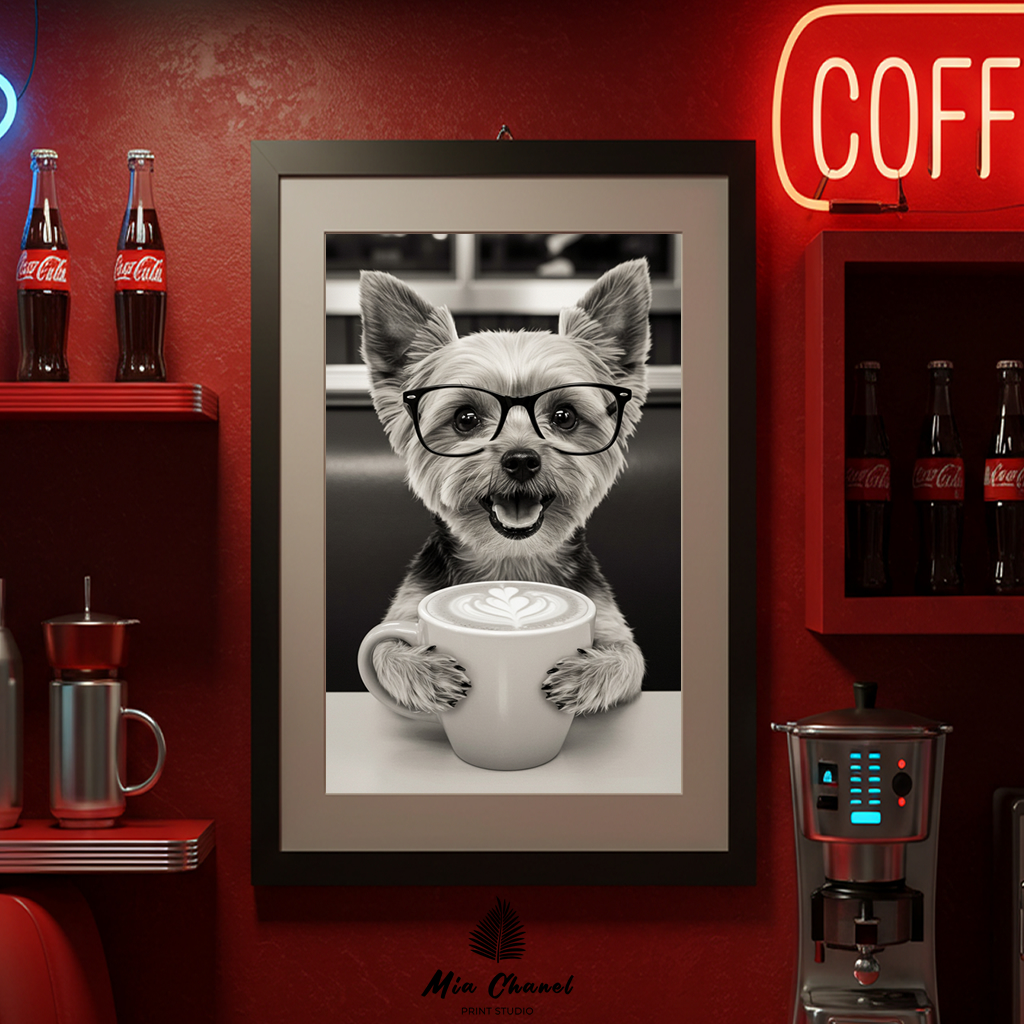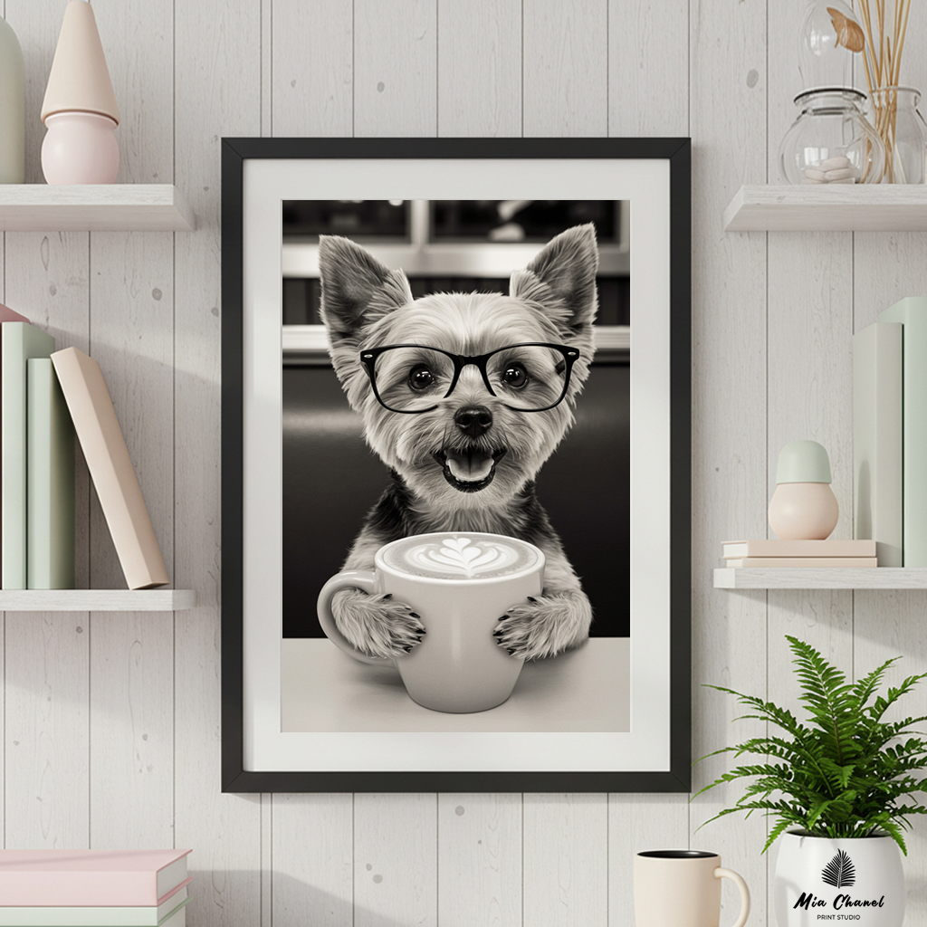 Bring a dose of adorable humor to your home with this charming black and white art print! This sweet image features a cute Yorkshire Terrier looking patiently at the camera with a pair of stylish glasses and holding a delicious-looking mug of coffee complete with beautiful latte art.
